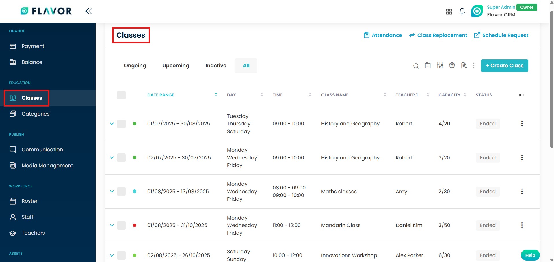 - This will open the Classes module, where all ongoing, upcoming and inactive classes are listed.