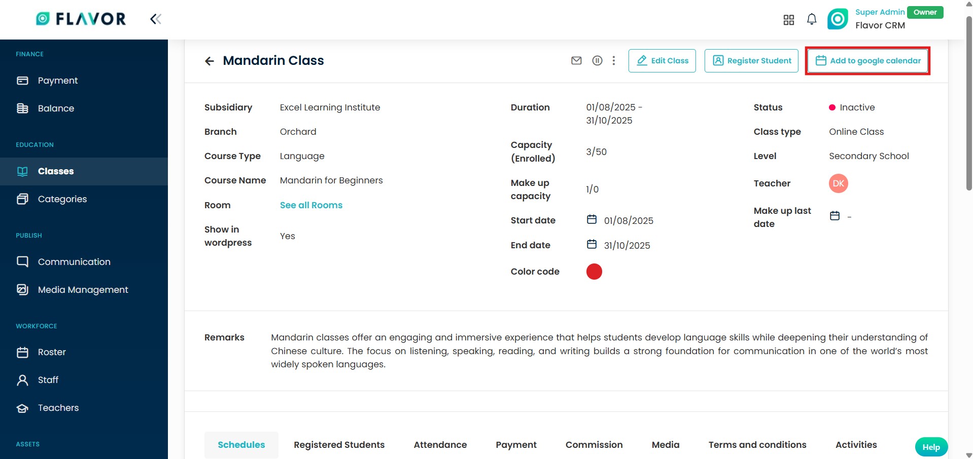 Once you’ve opened the specific class you want to export, Flavor CRM makes it easy to add it directly to your Google Calendar using the built-in integration.
