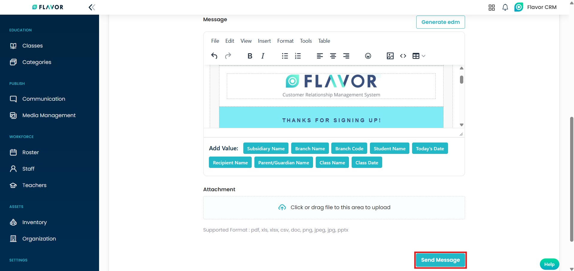 - After clicking Save and Close, the designed EDM is embedded directly into the Message.