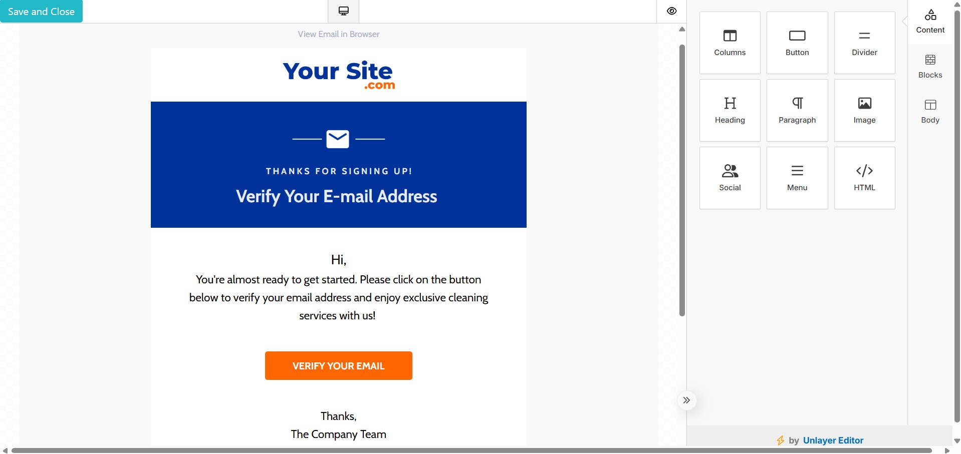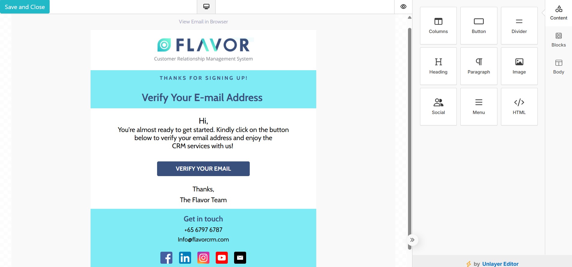 - Customize the EDM as per your requirements, once design is completed, click on Save and Close.