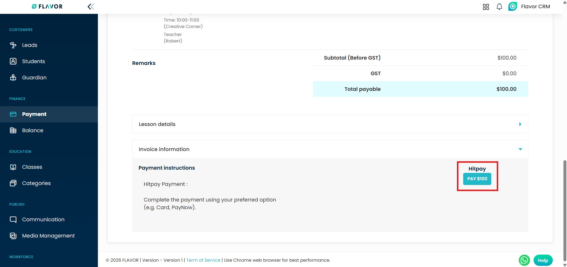 The button clearly shows the payable amount (e.g., Pay $100). Clients can click on this button to proceed with the payment using their preferred method such as Card or PayNow.