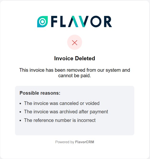 If a previously sent invoice has been deleted, cancelled, or voided, it will no longer be available for payment.