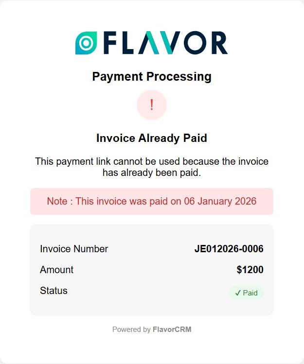 When a client attempts to pay an invoice that has already been paid, a message is displayed indicating that the invoice has been paid and the payment link is no longer valid.