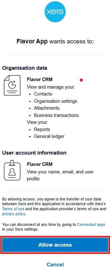 - When you click on Connect, you will be redirected to the Xero login and authorization page.