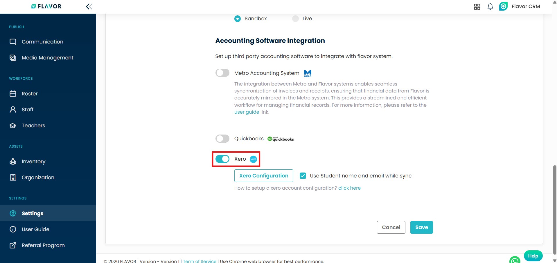 - Switch the Xero toggle On. Note : Also select Use Student name and email while sync if you want student details to be synced.