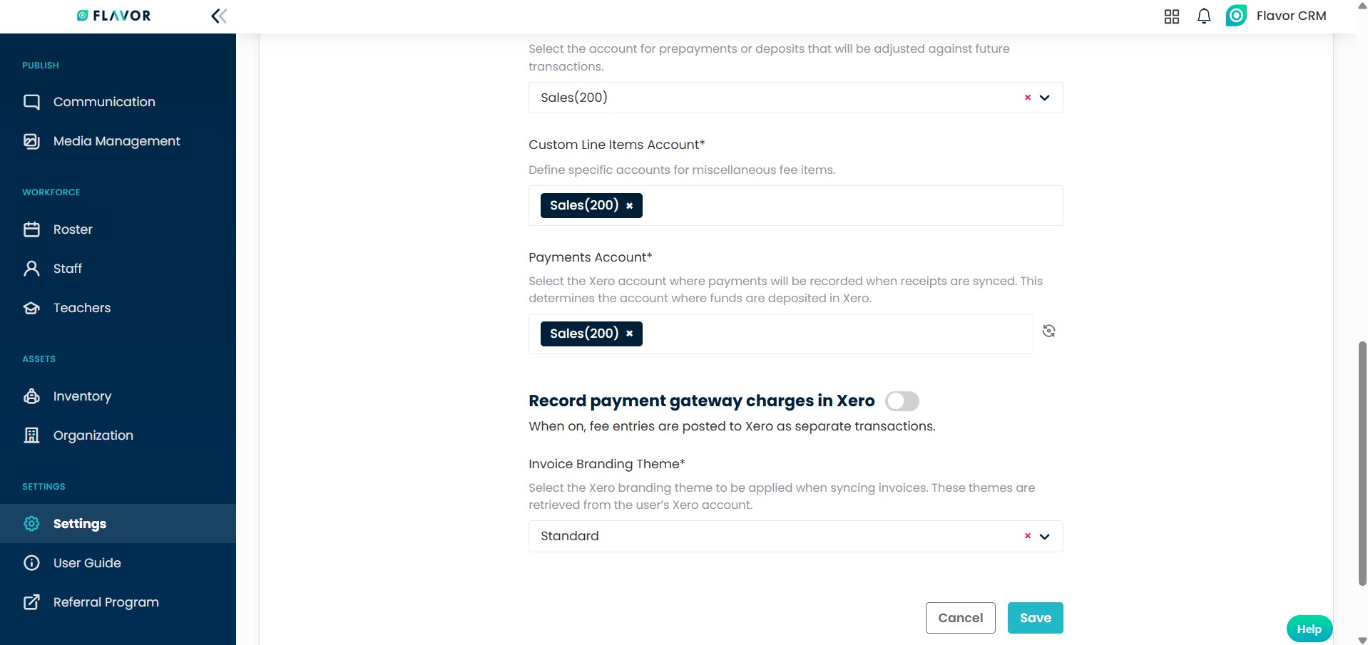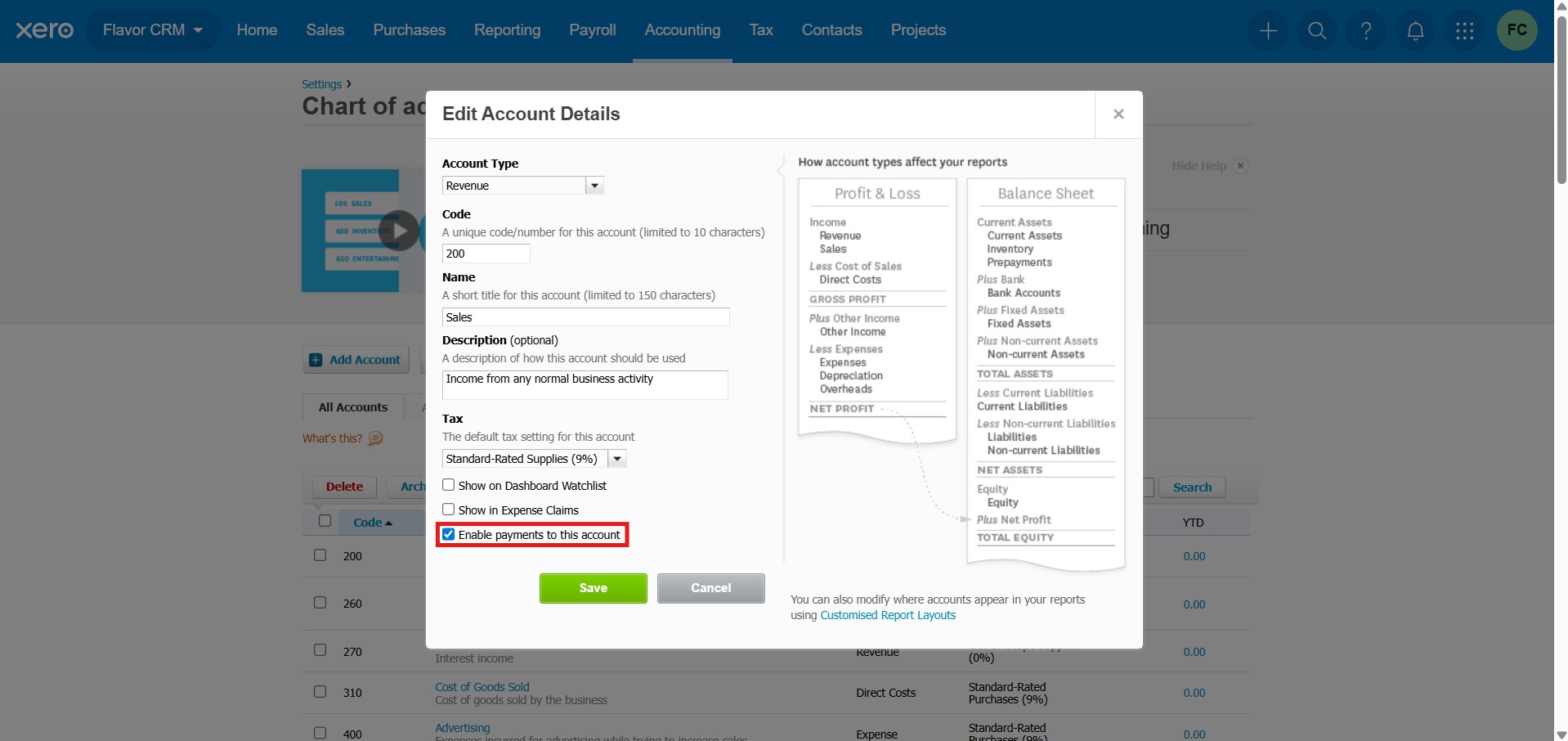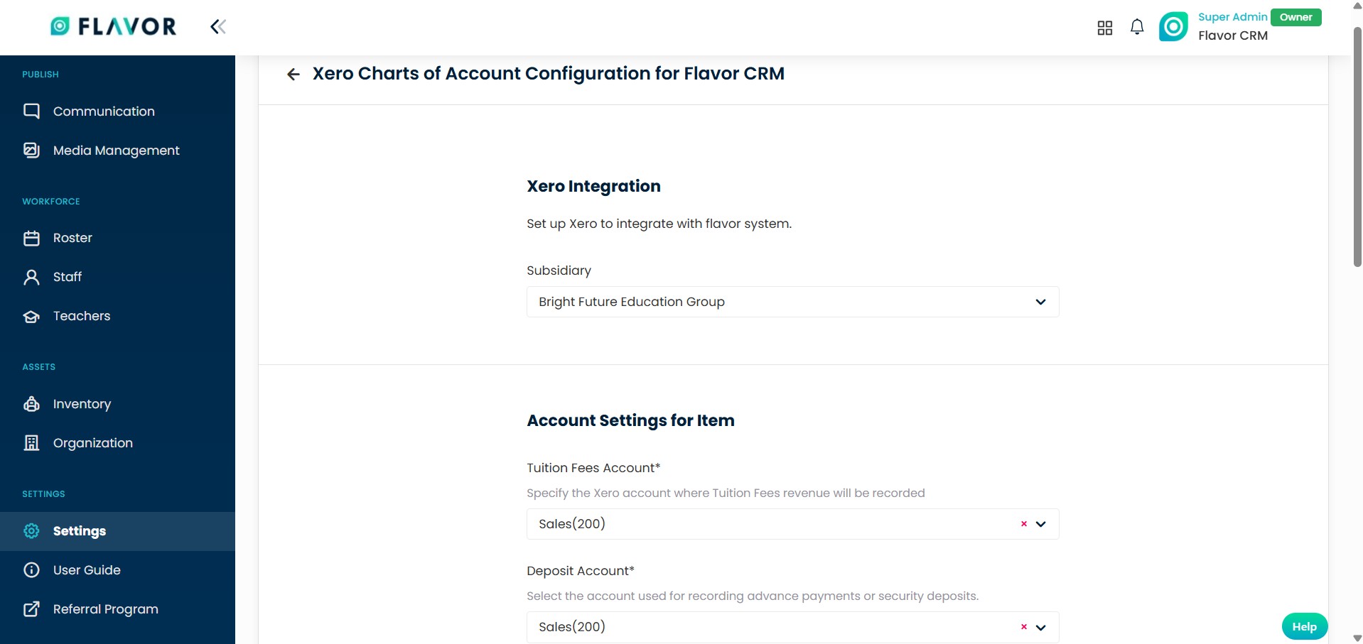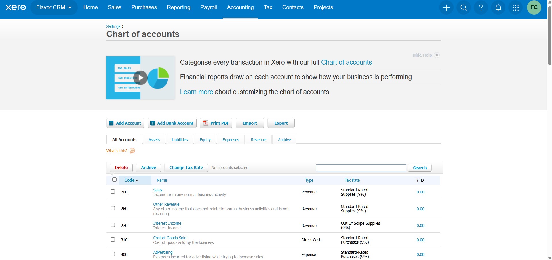- This will open the Xero Chart of Accounts Configuration screen within Flavor CRM.