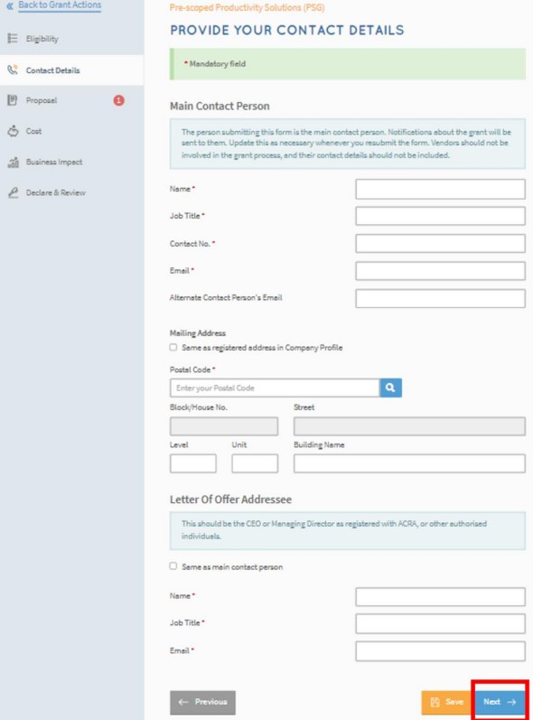 - Fill in details of the main contact person.