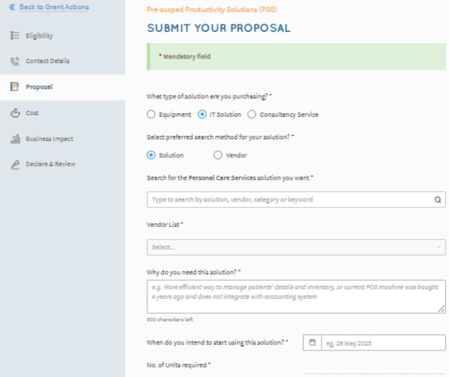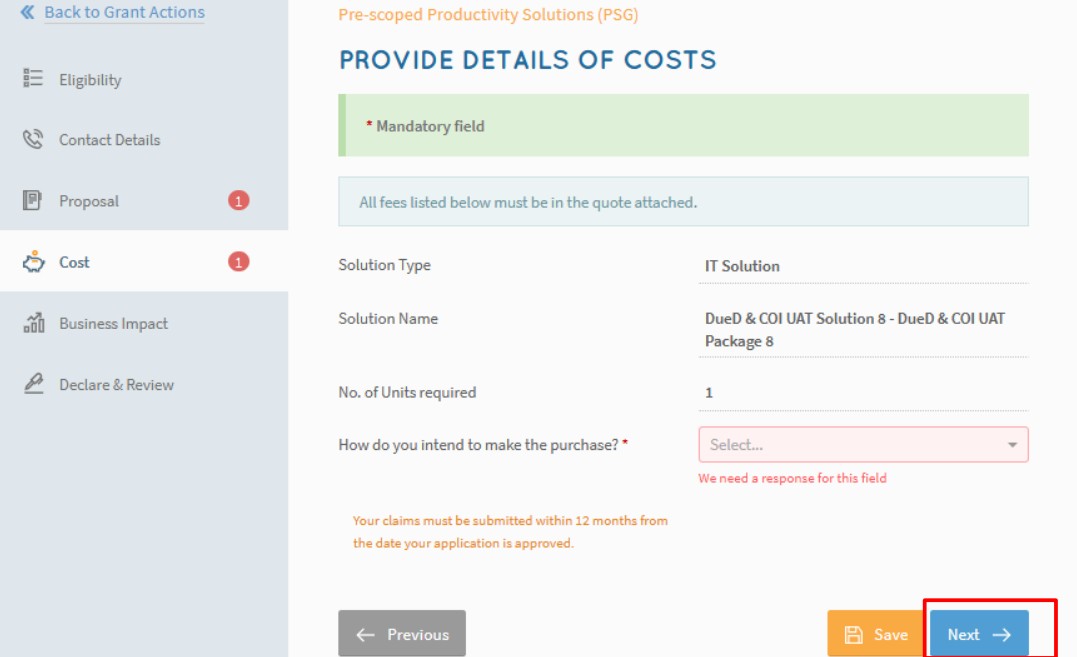 - Fill in details of project cost. Ensure that the quoted items and costs are as per Annex 3 of the PSG pre-qualified solution package.