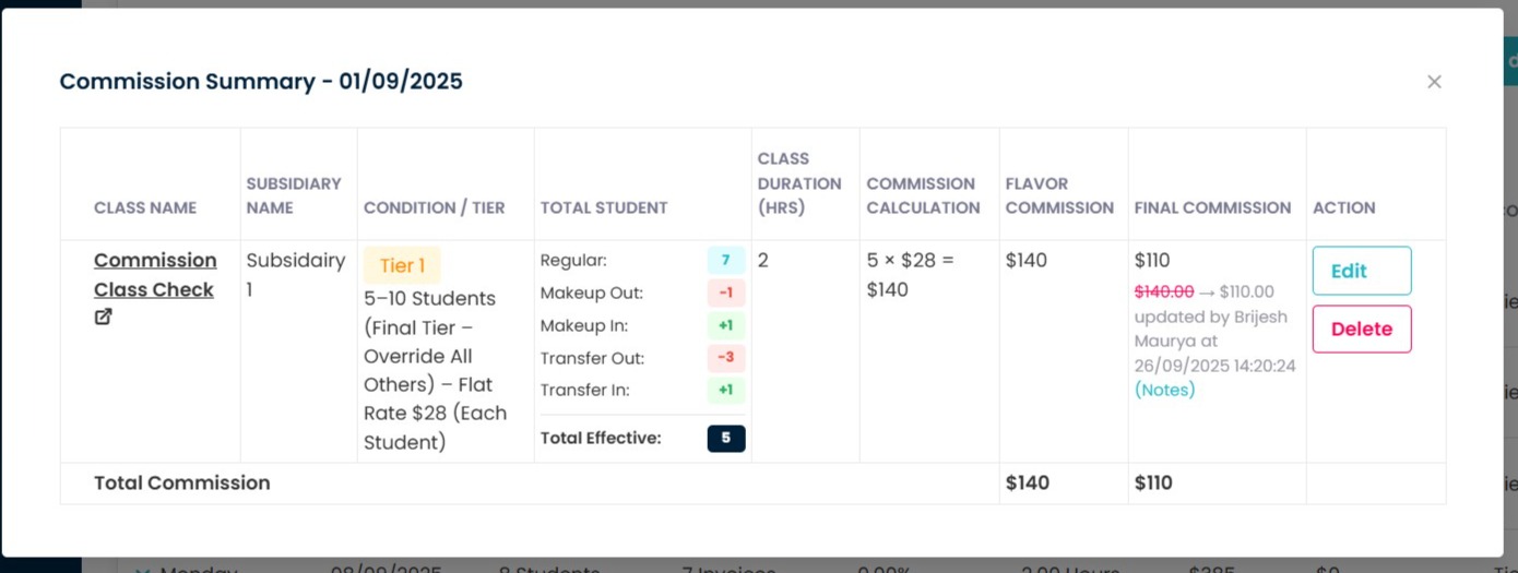 Edit: Allows you to modify the class commission line. You can change the amount and add an audit note explaining the change.