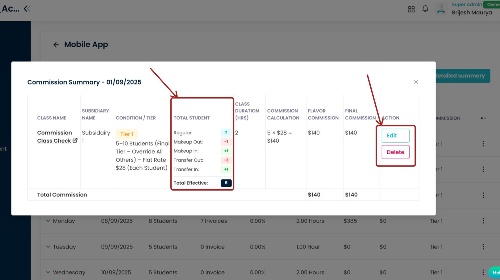 Delete: Removes the commission calculated for that specific day after confirmation.