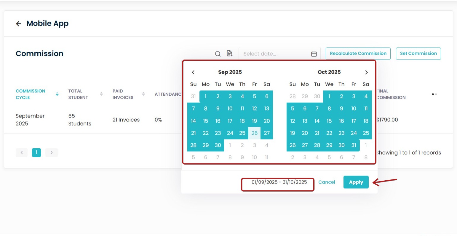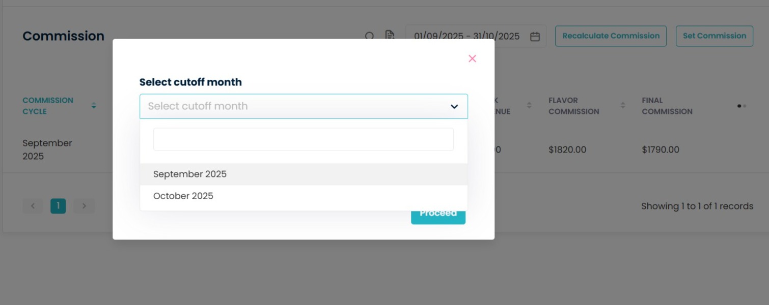 You can select the cut-off month to define the date or month from which the commission calculation should begin. -