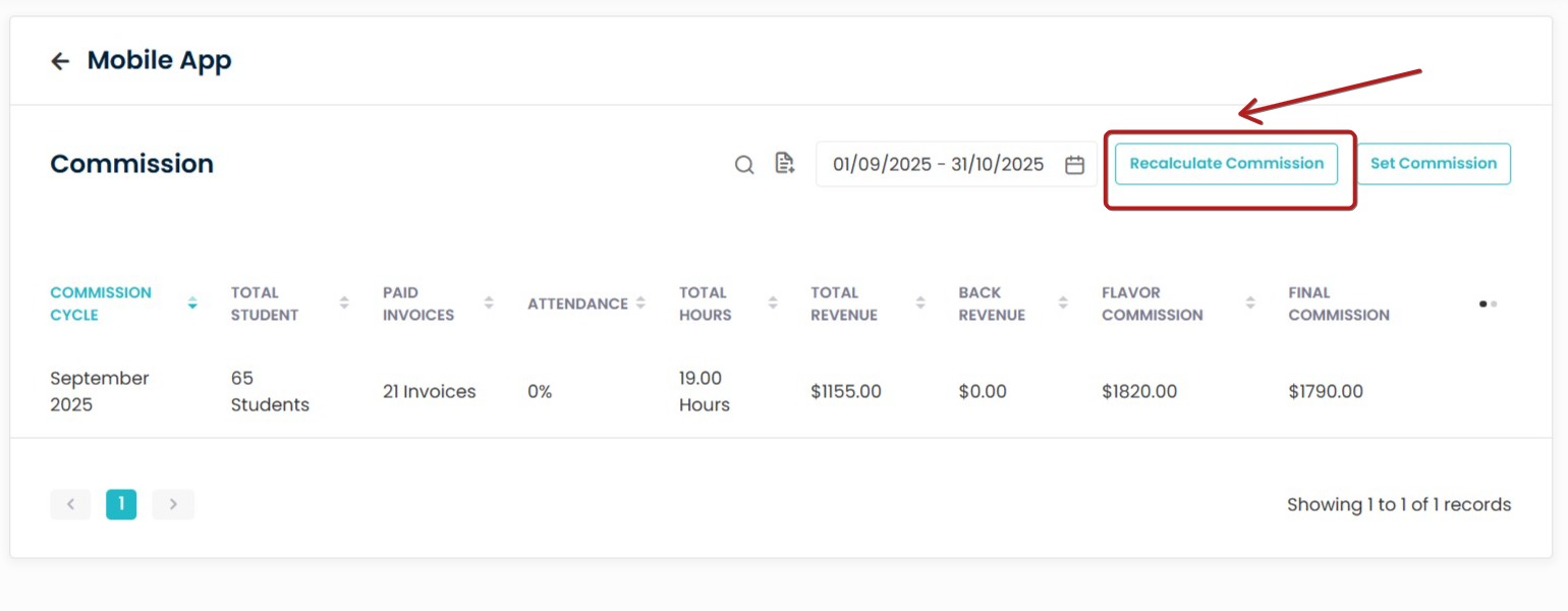 Click the Recalculate Commission button to generate updated commission details for the selected date range.