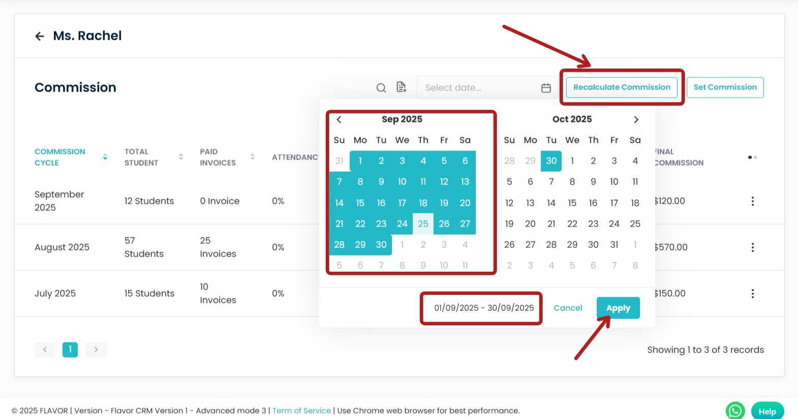 Choose the required start and end dates (e.g., 01/09/2025 – 30/09/2025).