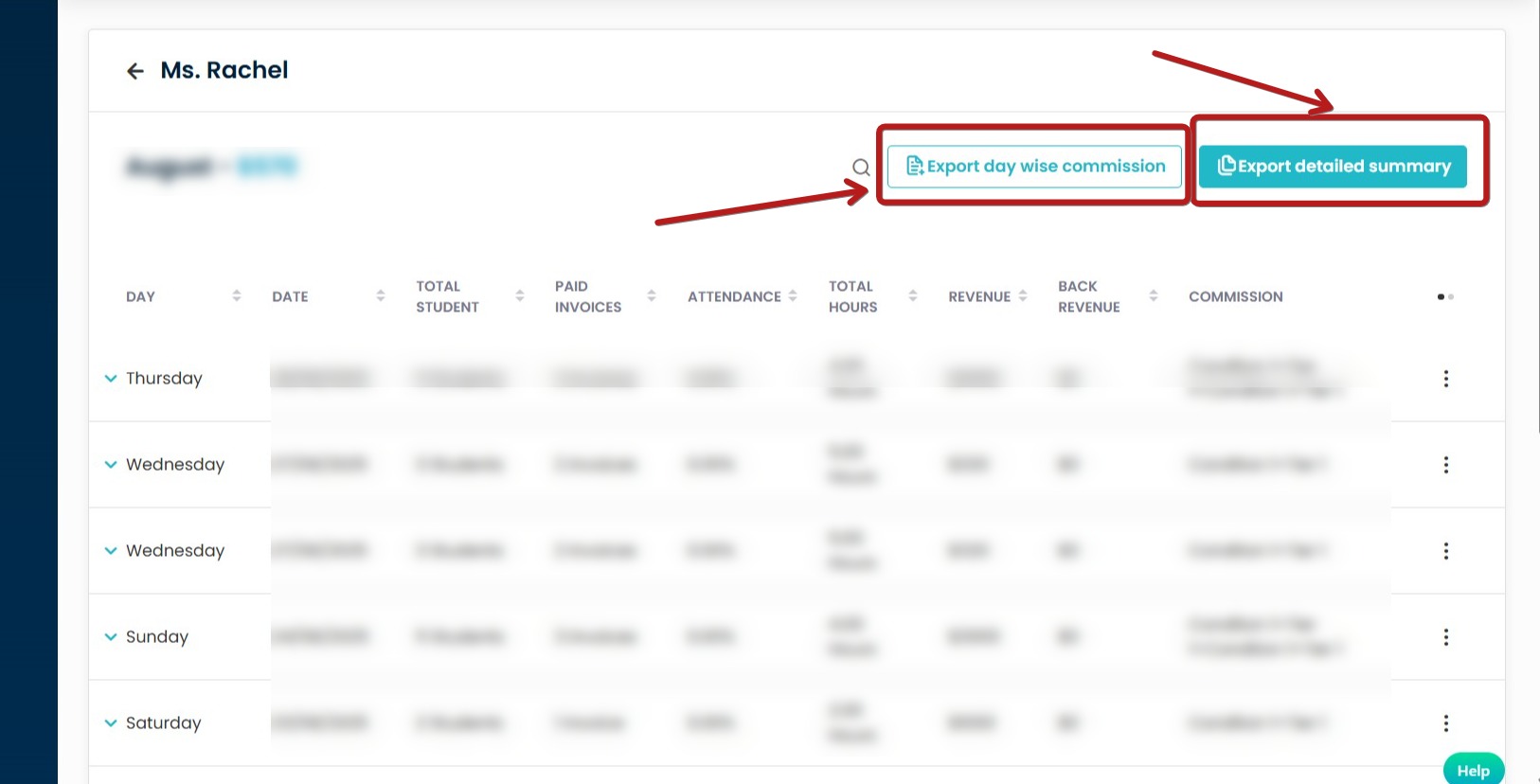 - Use ‘Export Detailed Summary’ to generate reports containing class name, schedule, timings, student information, invoice details, and attendance records.