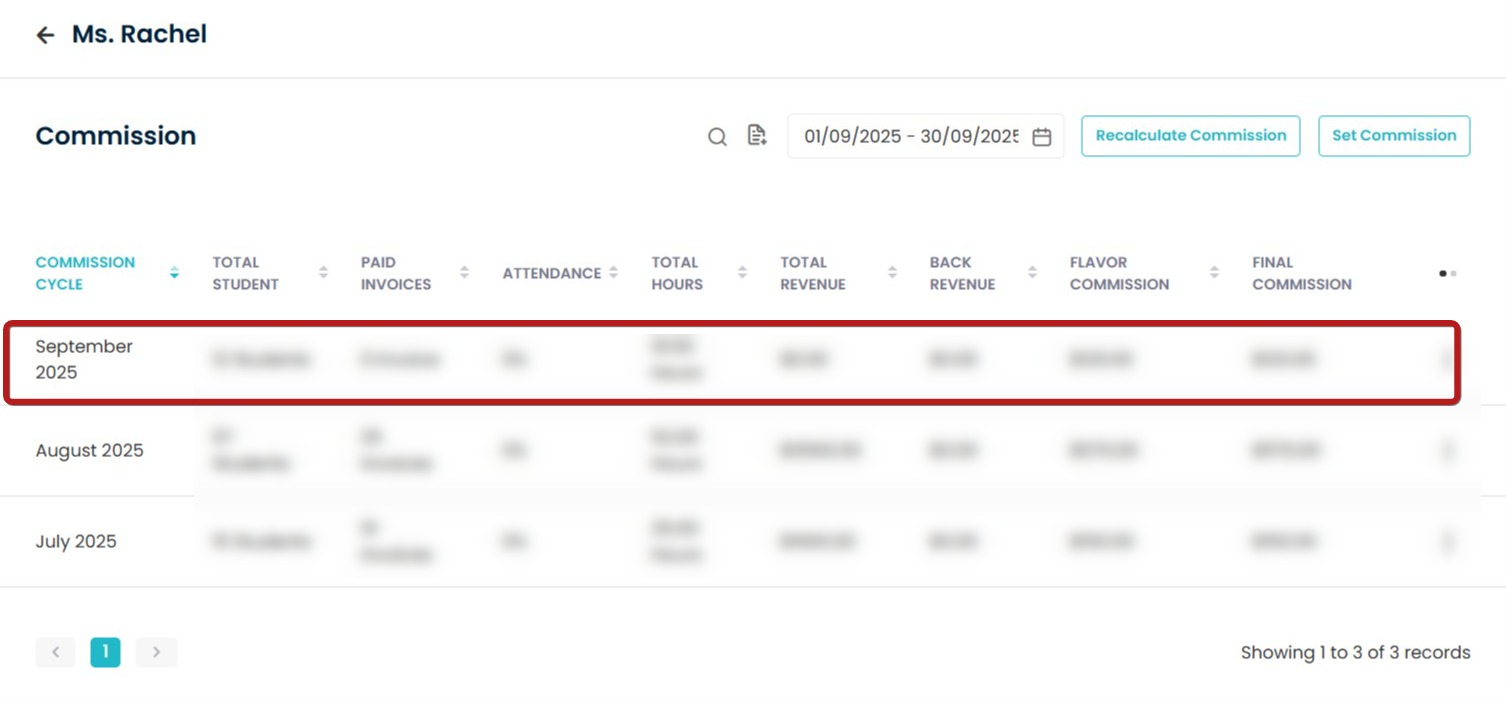 The system will refresh and display the recalculated commission records for the staff member. Click the selected month and open it.